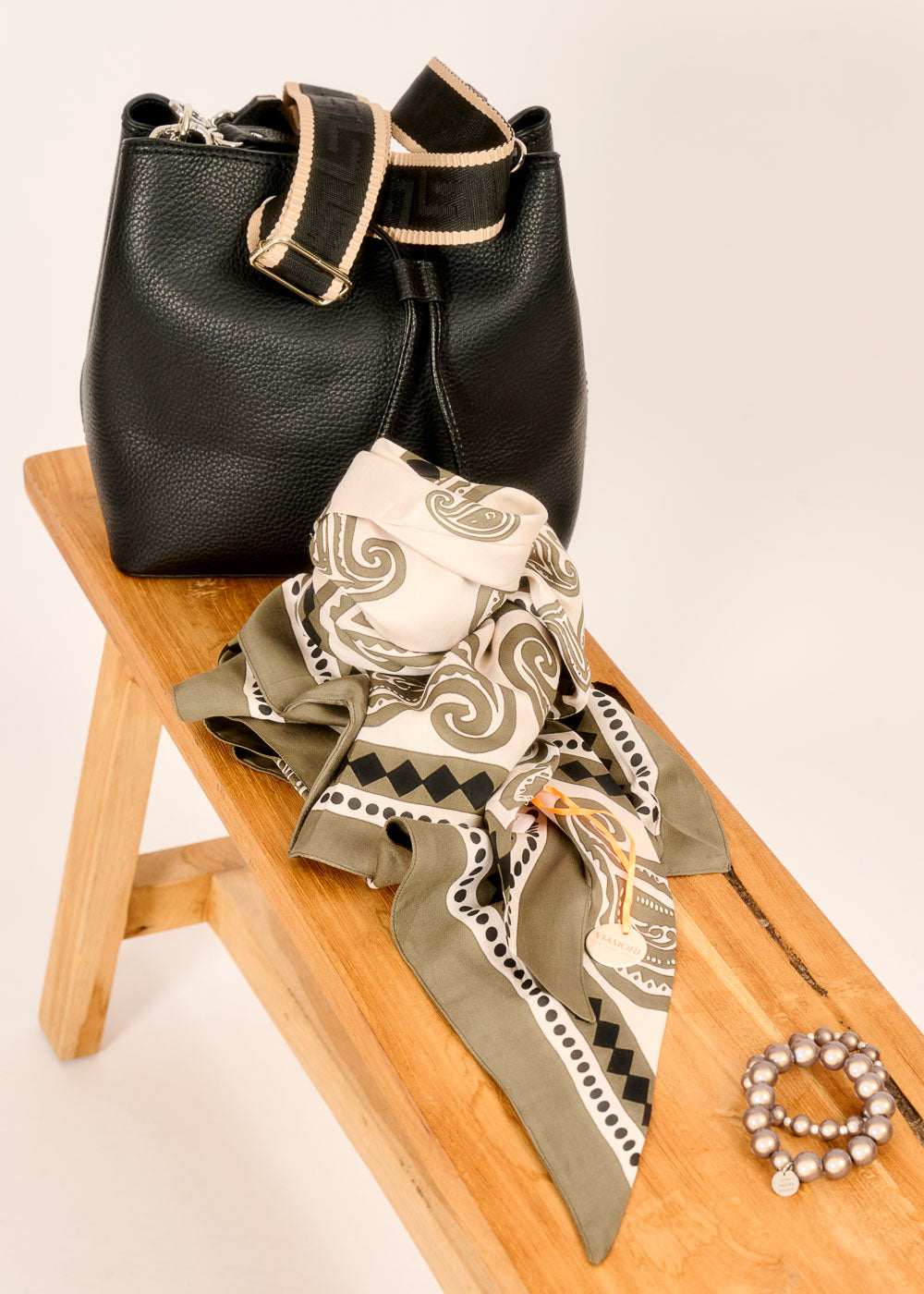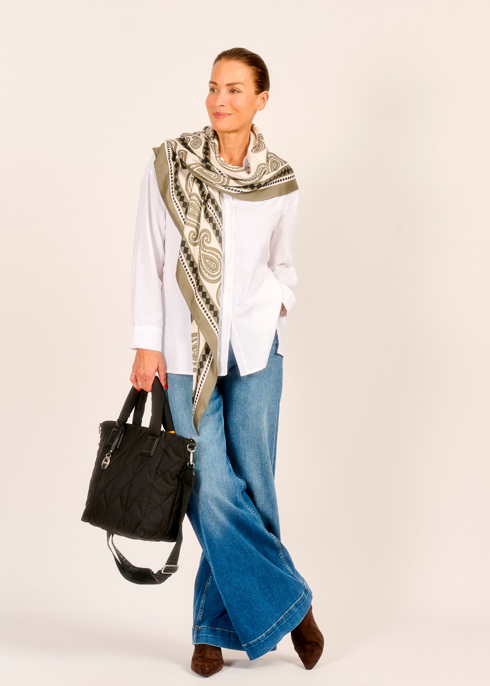 Ein Tuch mit Wow-Effekt: Unser Tuch Triangolo Paisley in Oliv und Creme ist ein echter Blickfang. Das wunderschöne Paisley-Muster mit geometrischen Akzenten verleiht deinem Look eine moderne und künstlerische Note. Aus einem leichten, hochwertigen Material gefertigt, fällt es elegant und bietet vielseitige Styling-Möglichkeiten. Egal, ob lässig geknotet oder elegant drapiert – dieses Tuch verleiht deinem Outfit den letzten Schliff.