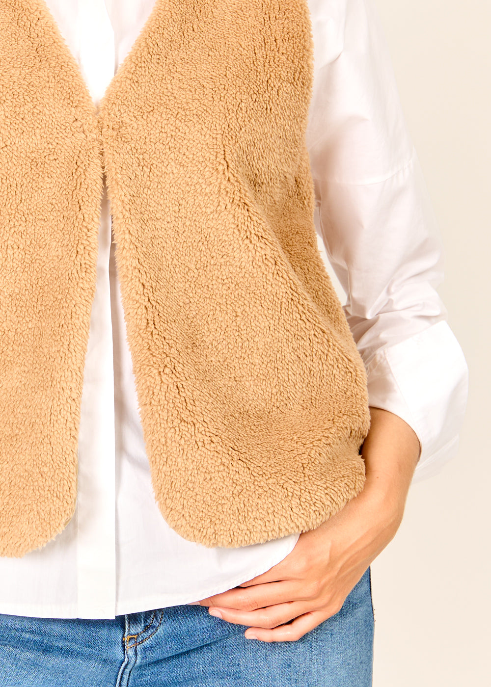 Ein flauschiger Traum für die Übergangszeit: Diese Teddyweste in einem warmen Nude-Ton verleiht jedem Outfit eine Portion Gemütlichkeit. Ihr weicher Stoff fühlt sich angenehm an und sorgt für eine Extraportion Wärme, ohne aufzutragen. Perfekt, um schlichte Basics in einen trendigen und zugleich komfortablen Look zu verwandeln.