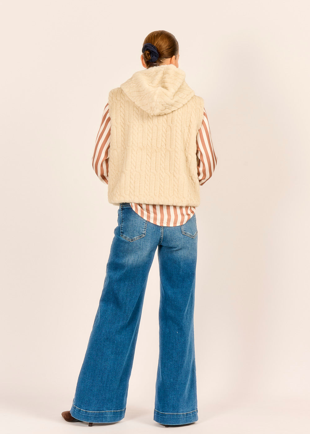 Diese edle Weste in luxuriöser Fake Fur Qualität besticht durch ihr raffiniertes, in den Stoff eingearbeitetes Zopfmuster, das ihr eine einzigartige Textur und Tiefe verleiht. Sie präsentiert sich als sehr edles und stylisches Statement-Piece, das mühelos schlichte Looks aufwertet und sofort eine glamouröse Note hinzufügt. Tragen Sie diese Weste als elegante Schicht über Blusen oder Feinstrick und genießen Sie ein kuscheliges Tragegefühl, ohne auf modischen Chic verzichten zu müssen.