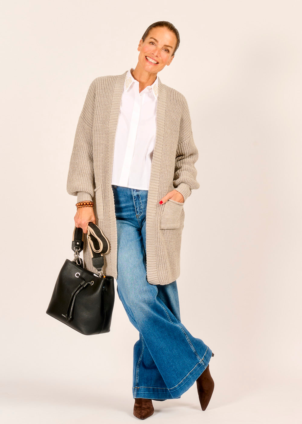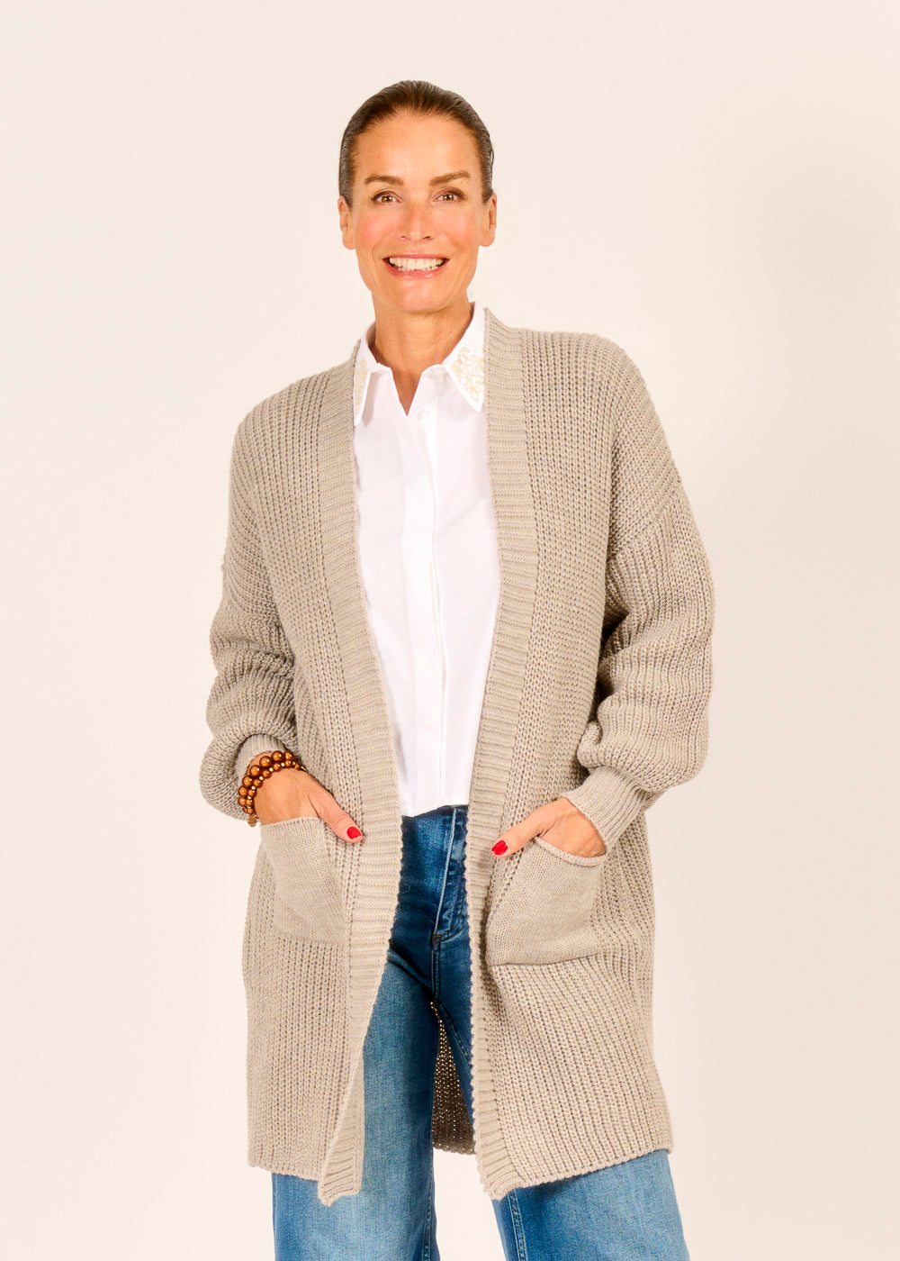 Erlebe lässige Eleganz mit unserem langen Strickmantel in einem edlen Taupe-Ton. Die grobe Strickstruktur und der lange Schnitt machen ihn zum perfekten Layering-Piece. Ob über einem schlichten Hemd oder einem kuscheligen Pullover, dieser Mantel verleiht jedem Look eine entspannte und stilvolle Note.