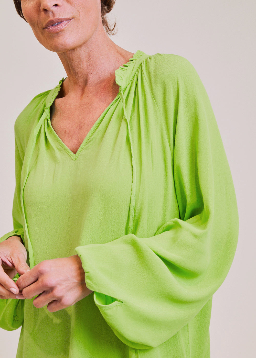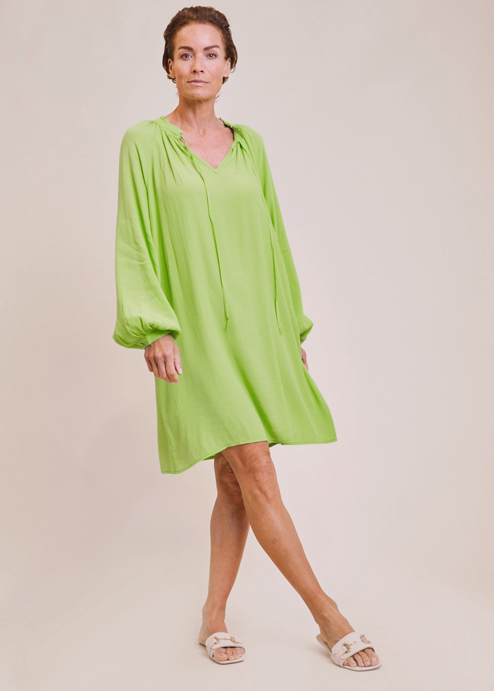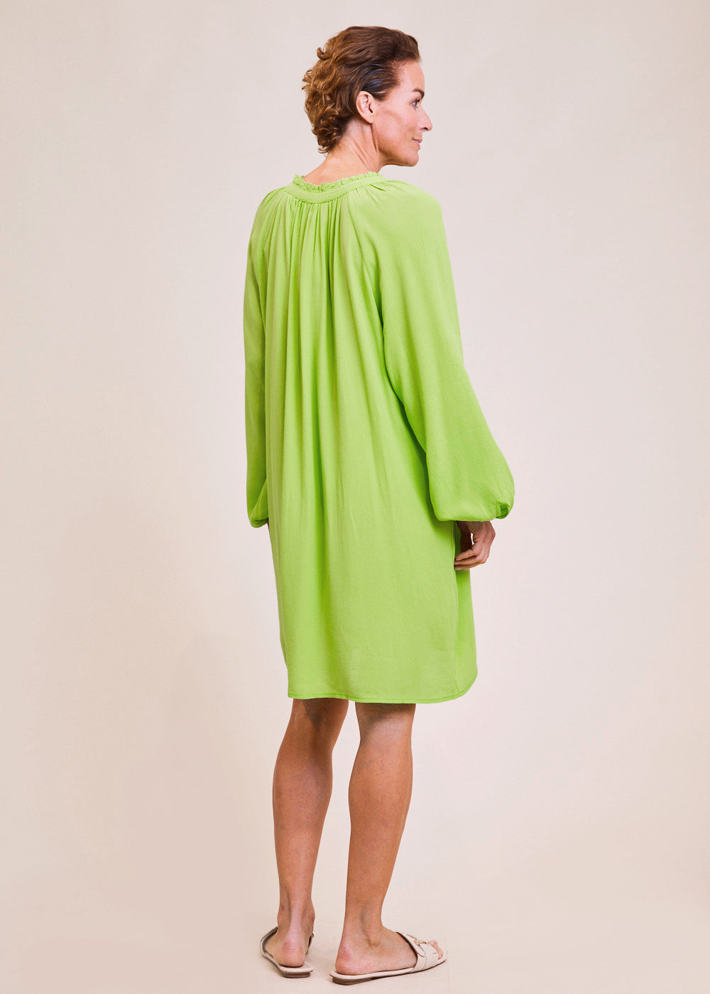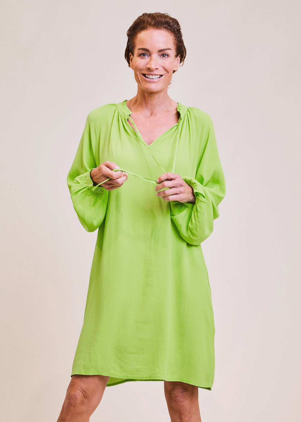 Luftig leichte Tunika in frischem Limettengrün. Das Kleid hat angedeutete Ballonärmel, die sich durch das Bündchen verschmälern. Das Dekoltée ist V-förmig ausgeschnitten und hat zwei Schmuckbänder, die nach belieben gestylt werden können. Unsere Longtunika ist der perfekte Look für den Sommerurlaub und macht durch ihre besondere Qualität viel Spaß beim Tragen!