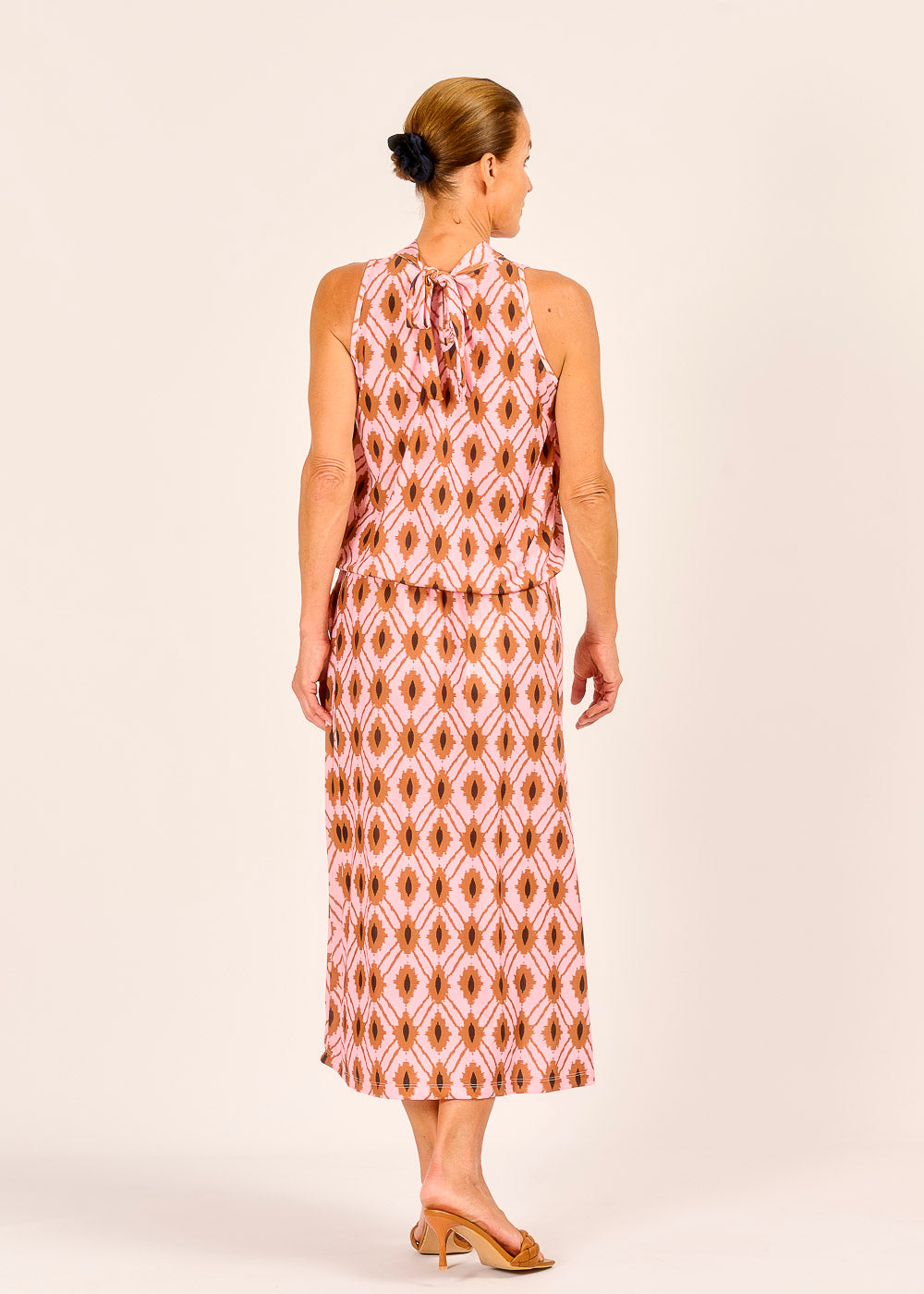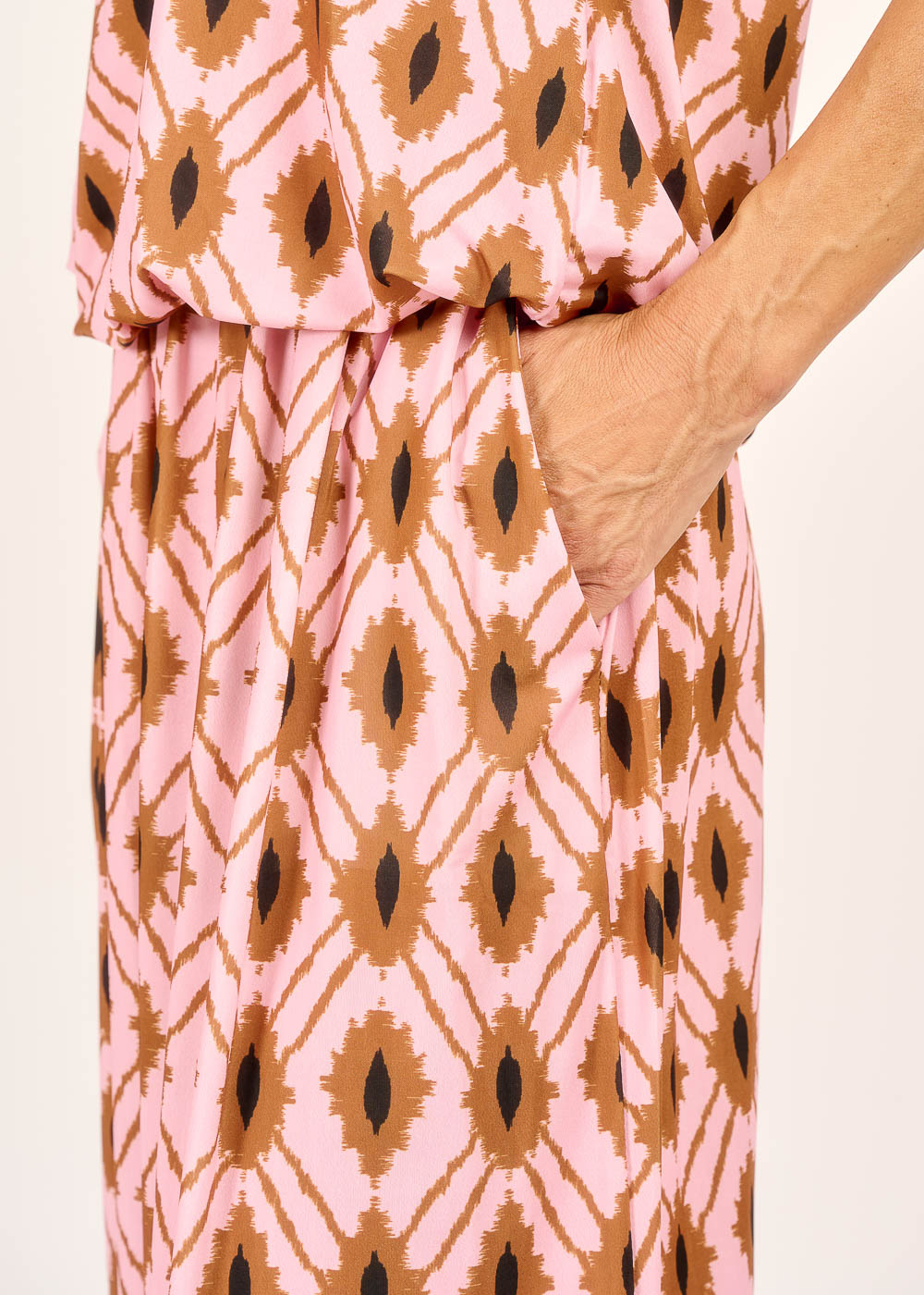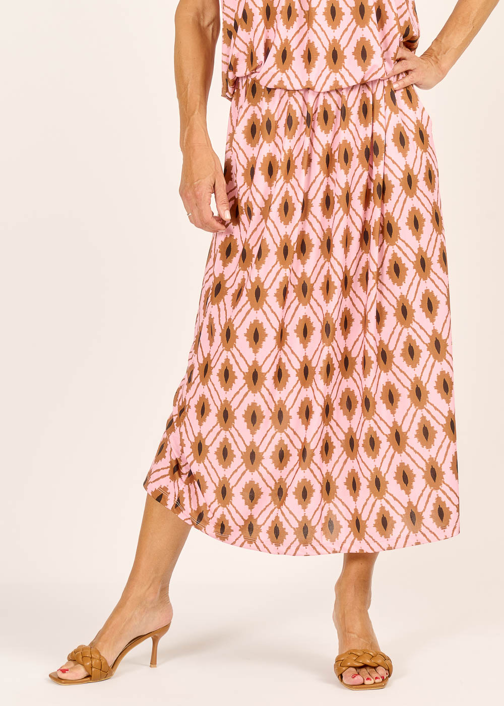 Dieser fließende Rock mit seinem einzigartigen Muster in zarten Rosé- und Erdtönen ist ein echter Blickfang, der spielerische Eleganz versprüht. Der leichte Stoff und der bequeme Gummizug sorgen für optimalen Tragekomfort und eine wunderschöne Silhouette, die bei jeder Bewegung mitschwingt. Perfekt für einen entspannten Sommerlook oder stilvoll kombiniert für einen besonderen Anlass.