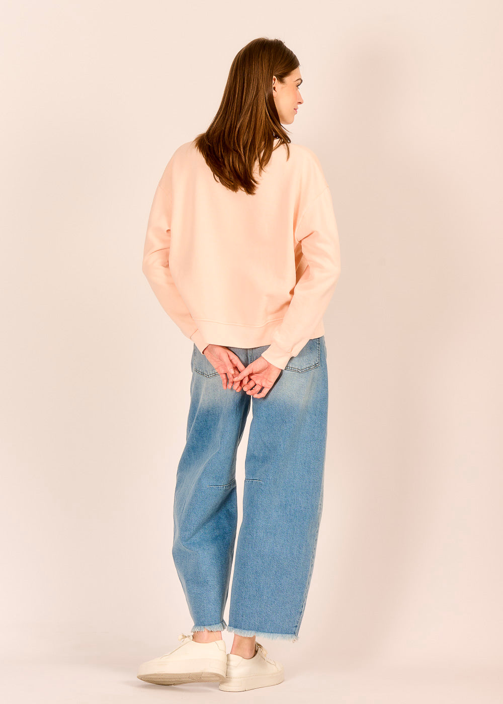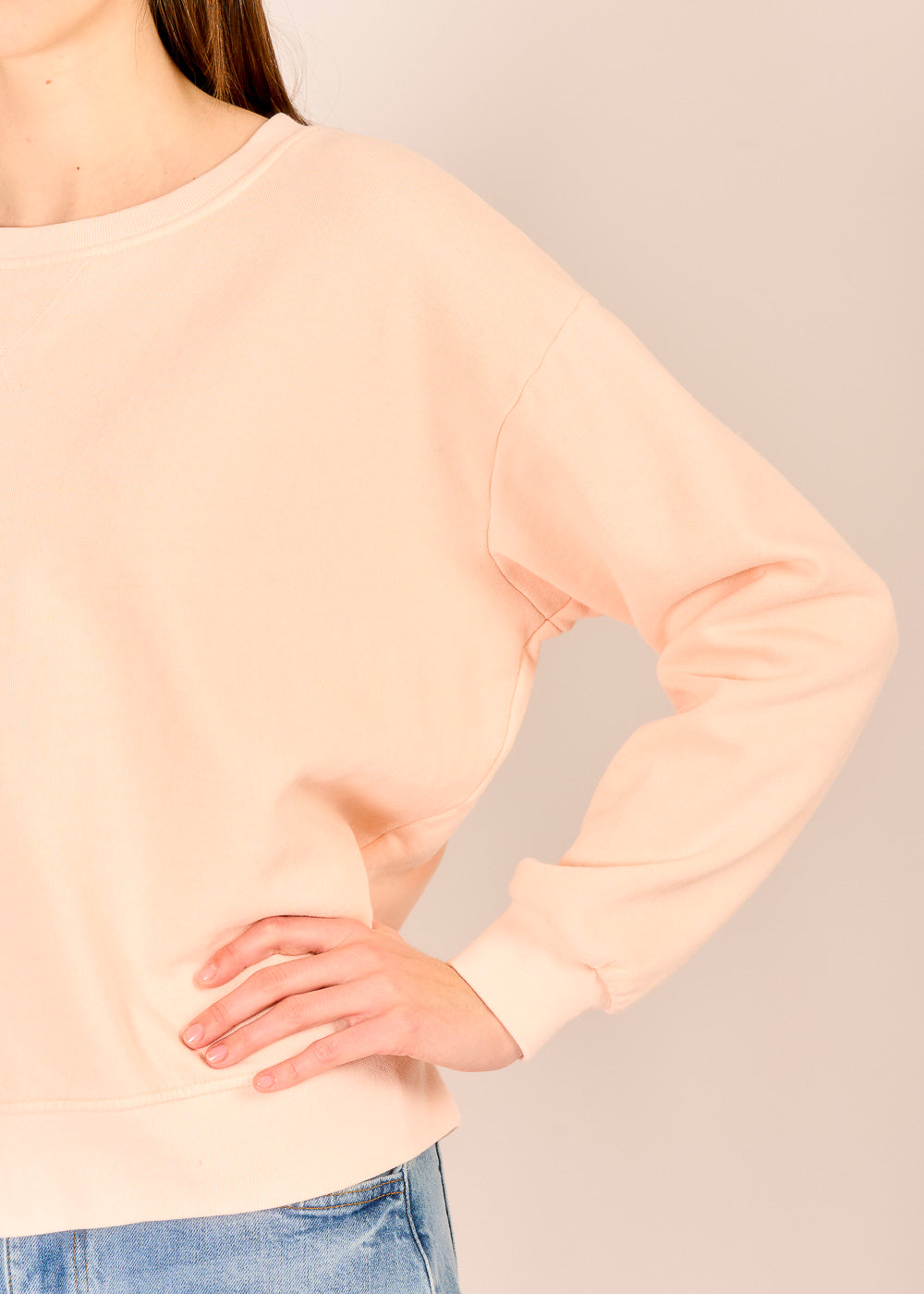 Das lässige Sweatshirt fühlt sich auf der Haut unglaublich soft an und begleitet dich entspannt durch den Alltag. Der zarte Farbton erinnert an Pfirsiche auf einem Markt in der Toskana und verleiht deinem Look eine feminine Leichtigkeit.