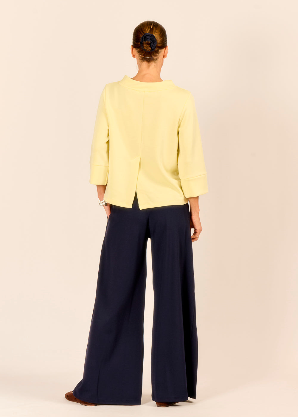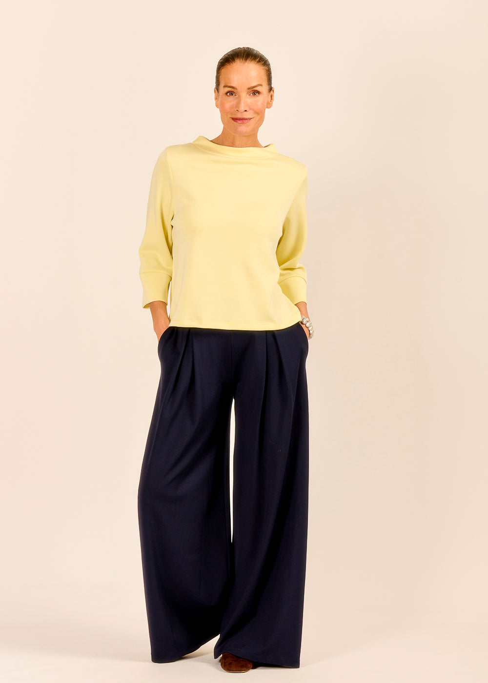 Die Falten verleihen der dunkelblauen Pantalone eine feminine, fließende Silhouette, während die hochwertige Viskose für ein komfortables Tragegefühl sorgt. Ein Lieblingsstück für alle, die Komfort und zeitlose Eleganz perfekt verbinden möchten.